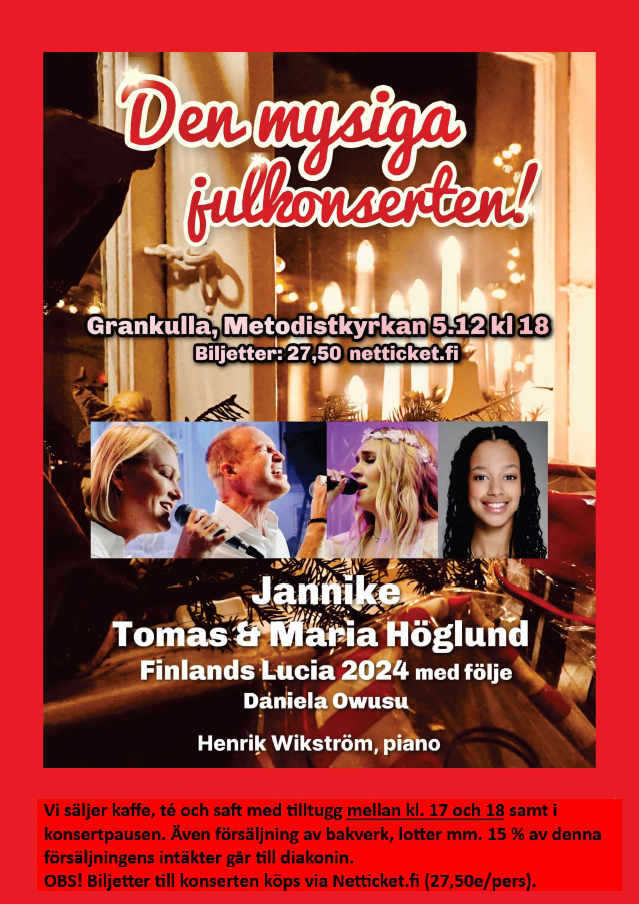Julkonsert med Jannike Sandström, Tomas & Maria Höglund m.fl. Vi säljer kaffe med tilltugg mellan kl. 17 och 18 samt på konsertpausen. Även försäljning av bakverk, lotter mm till förmån för församlingens verksamhet, 15 % går till diakonin.