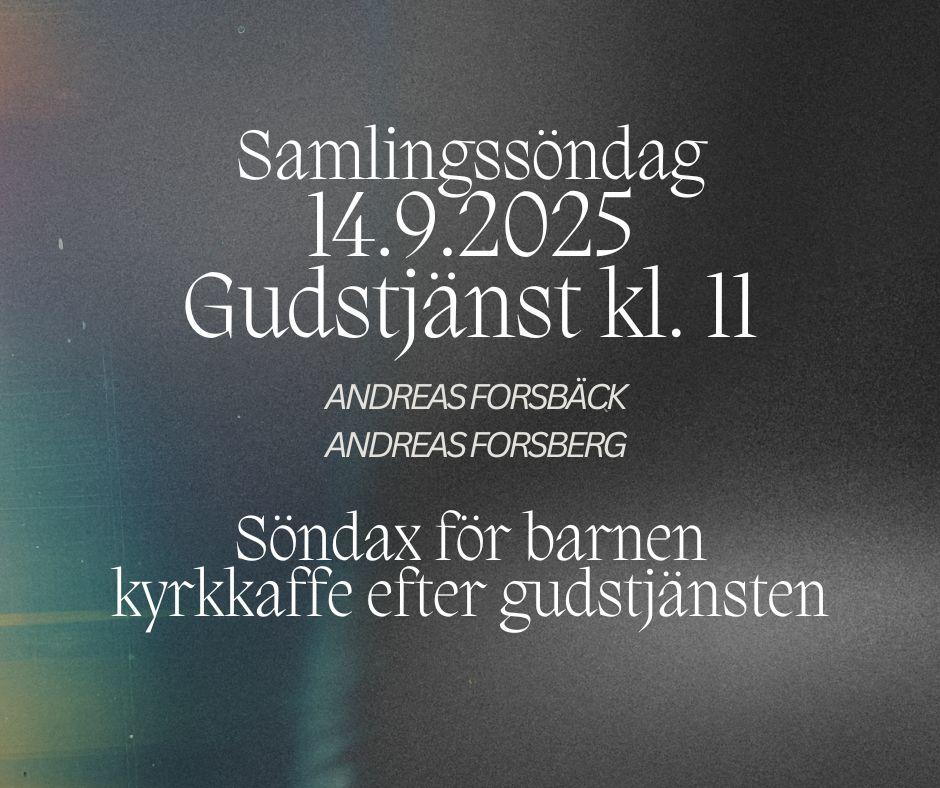 This upcoming Sunday September 14, at 11 am, we worship at 11 am in the sanctuary. Andreas Forsbäck preaches, Andreas Forsberg leads the music. Sunday school Söndax for the kids. After the worship service we share the fellowship at the coffee tables. Welcome to join us!